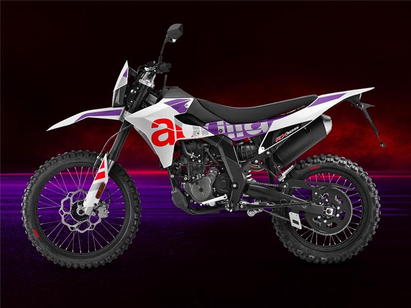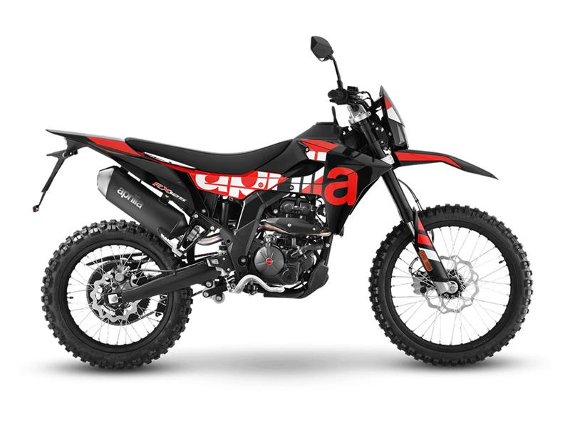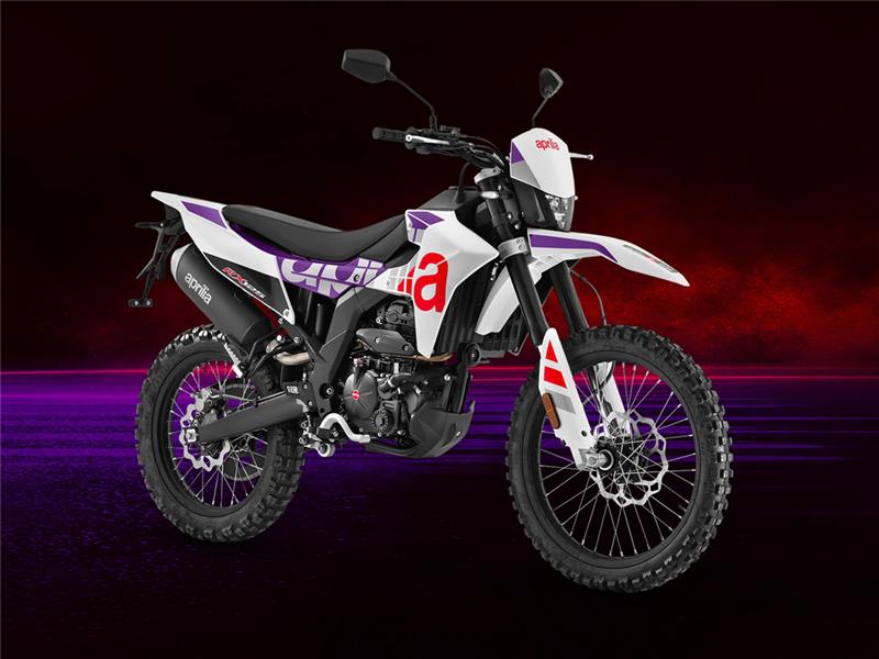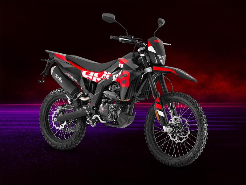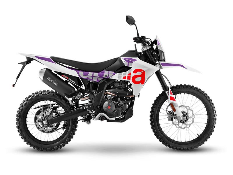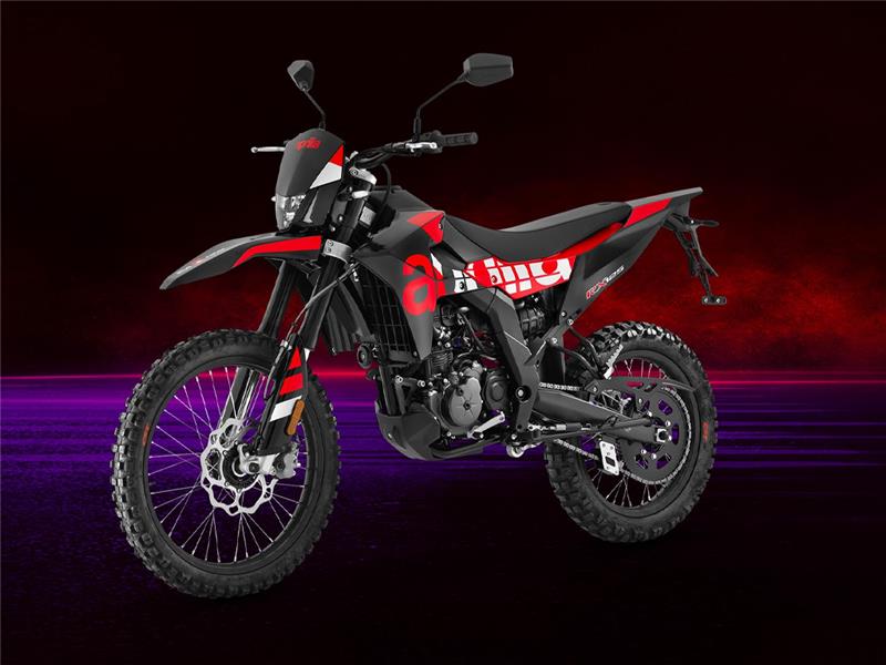 The design of the Aprilia RX 125 is sleek and minimalist, with sharp lines extending from front to rear, emphasising its racing DNA. The matte black exhaust seamlessly integrates with the glossy black frame, variable-section handlebar, engine and swingarm. The anodised glossy black wheels, sized for true off-road performance (21” front, 18” rear), combined with knobby tyres, ensure optimal control and traction on any terrain.