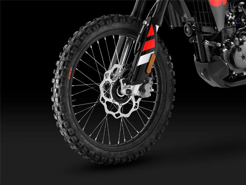 The RX 125's off-road spirit is reinforced by a top-tier chassis, designed to tackle even the most technical routes with agility. Its long-travel suspension offers 240 mm of travel at the front and 220 mm at the rear. The braking system features two wave discs—260 mm at the front and 220 mm at the rear—paired with single-channel ABS equipped with anti-rollover functionality. The engine is a modern, liquid-cooled, four-valve single-cylinder, optimised for strong acceleration and smooth power delivery.